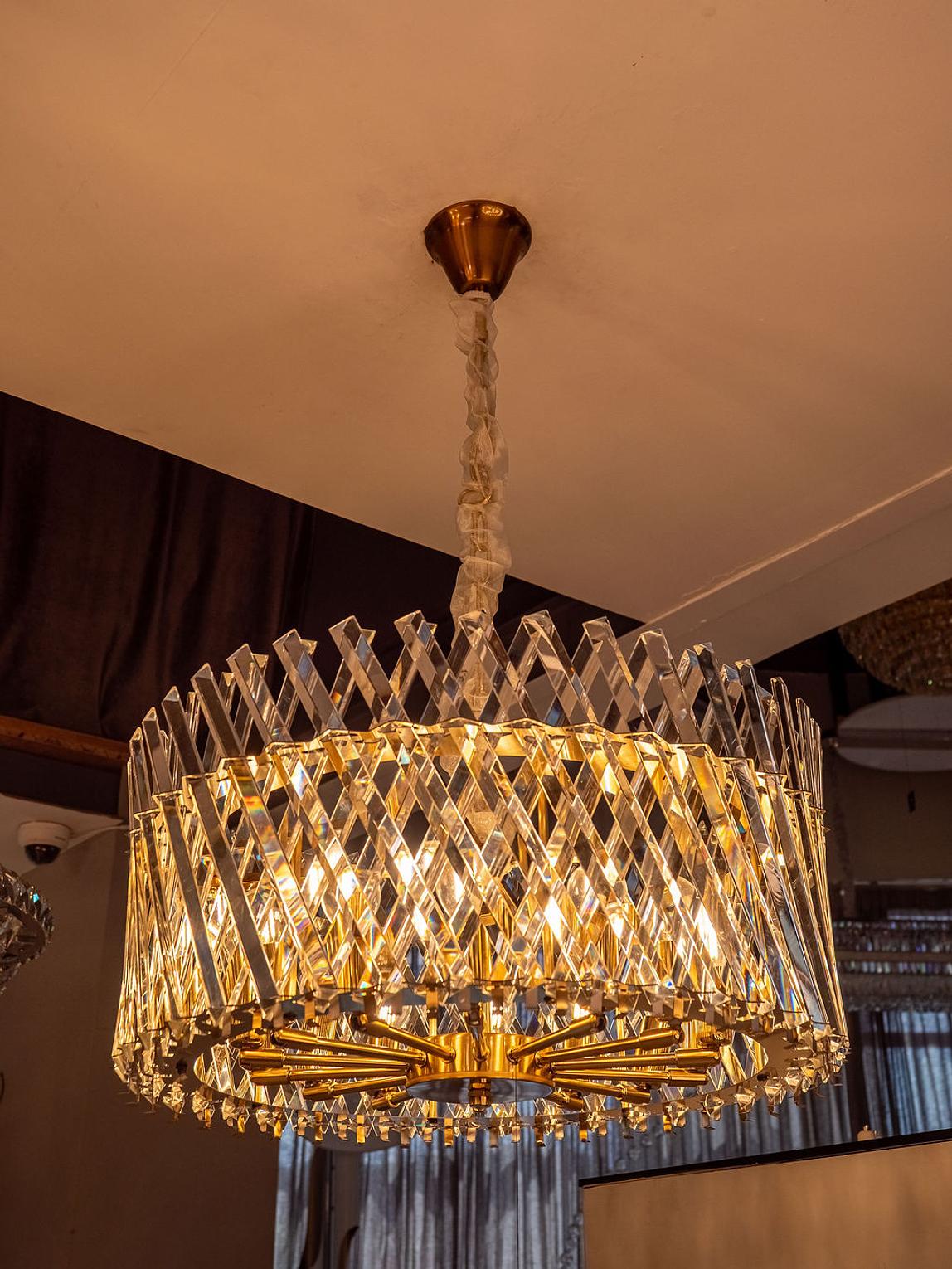 The Criss-Cross Crystal Chandelier is a masterwork of geometric precision and radiant luxury. This D400 model is defined by its unique criss-cross structural design, where high-clarity crystals are woven into a pattern that maximizes light refraction and visual depth. The frame is meticulously crafted from high-grade stainless steel and finished in a rich blend of gold and brass tones, offering a warm metallic luster that is both tarnish-resistant and enduring. As light passes through the angular crystal arrangements, it creates a dazzling tapestry of shimmer across your walls and ceiling, making it a perfect focal point for bedrooms, entryways, or sophisticated dressing rooms. Despite its compact 400mm diameter, the dense crystal layout ensures a high-impact aesthetic that feels both classical and modern. This chandelier combines structural durability with high-end decorative flair, providing a timeless lighting solution that enhances the ambiance of any upscale residential setting.