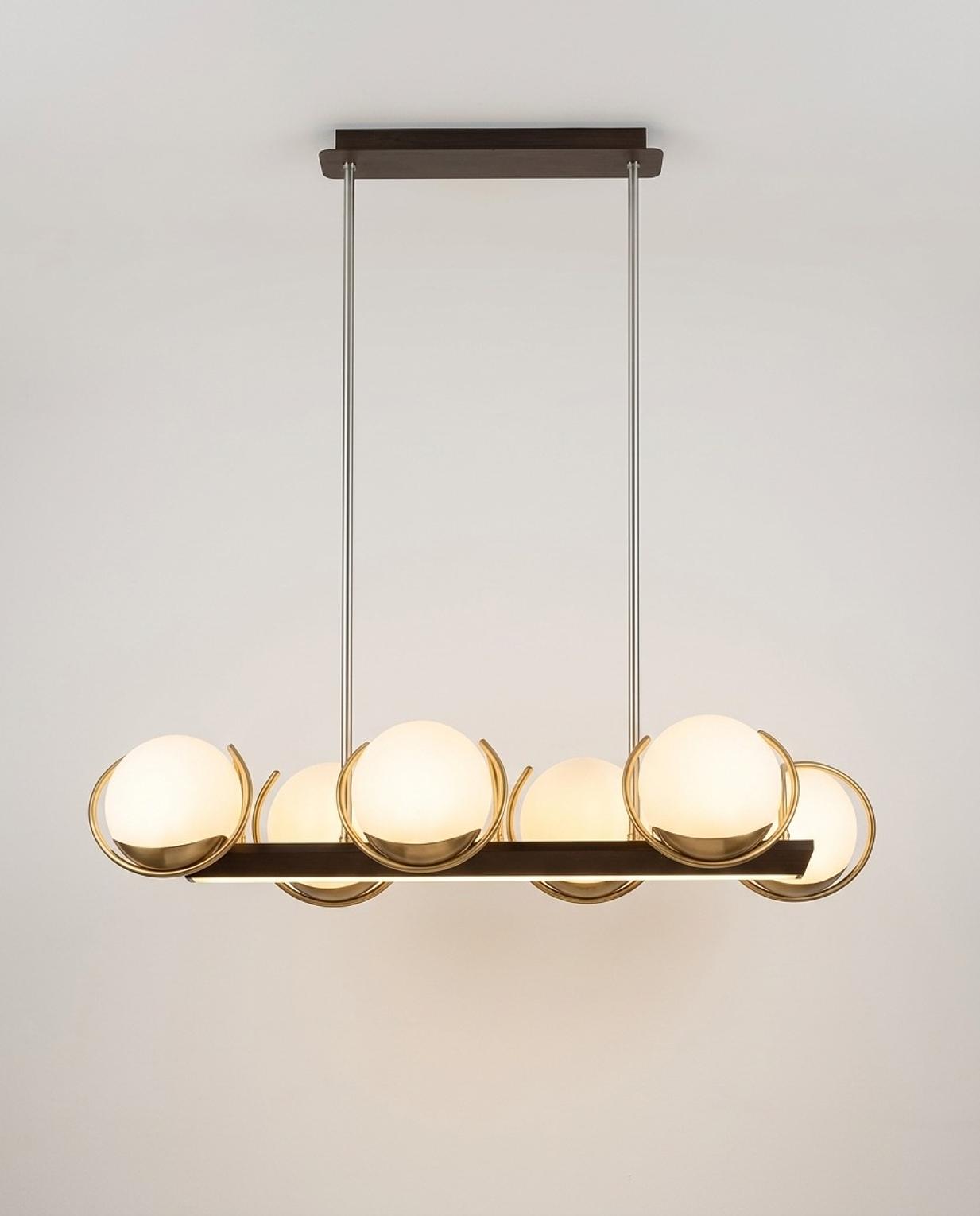 A sleek bar with three glowing globes, perfect for dining areas or kitchen islands.