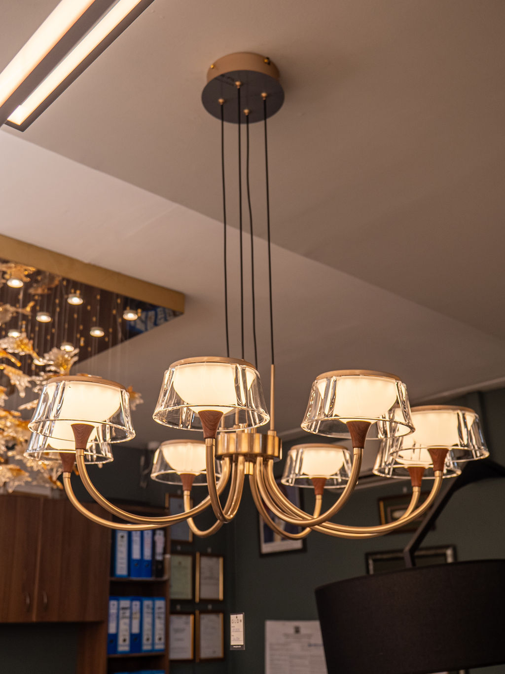 8 ARM LED IN BRONZE WITH ACRYLIC GLASS SHADES FINISHED IN ALUMINIUM+IRON 64W D800*H230